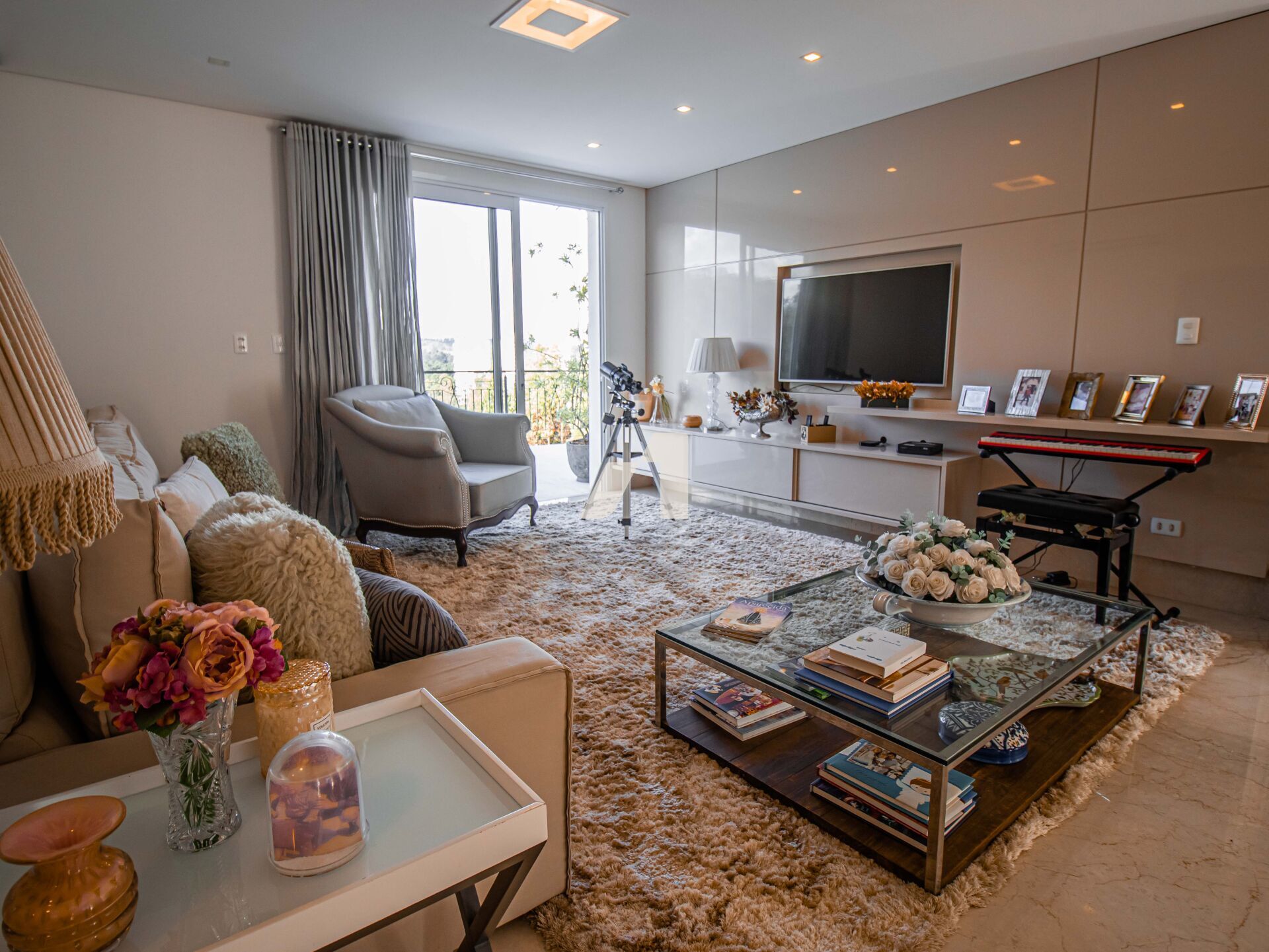 - Lareira elétrica com revestimento em mármore,