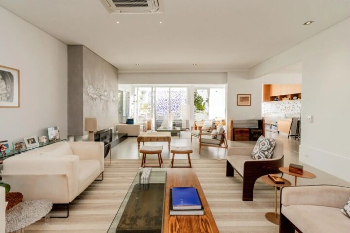 O living é integrado e imponente, com ambientes de estar e jantar conectados harmoniosamente à cozinha e ao espaço gourmet. O ar-condicionado central climatiza toda a casa de maneira uniforme e eficiente, garantindo conforto térmico em todas as estações do ano.