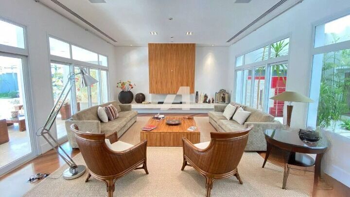 Casa térrea com living para quatro ambientes e recebe bastante luz natural através das grandes janelas de vidro, sendo um deles com um luxuoso bar.