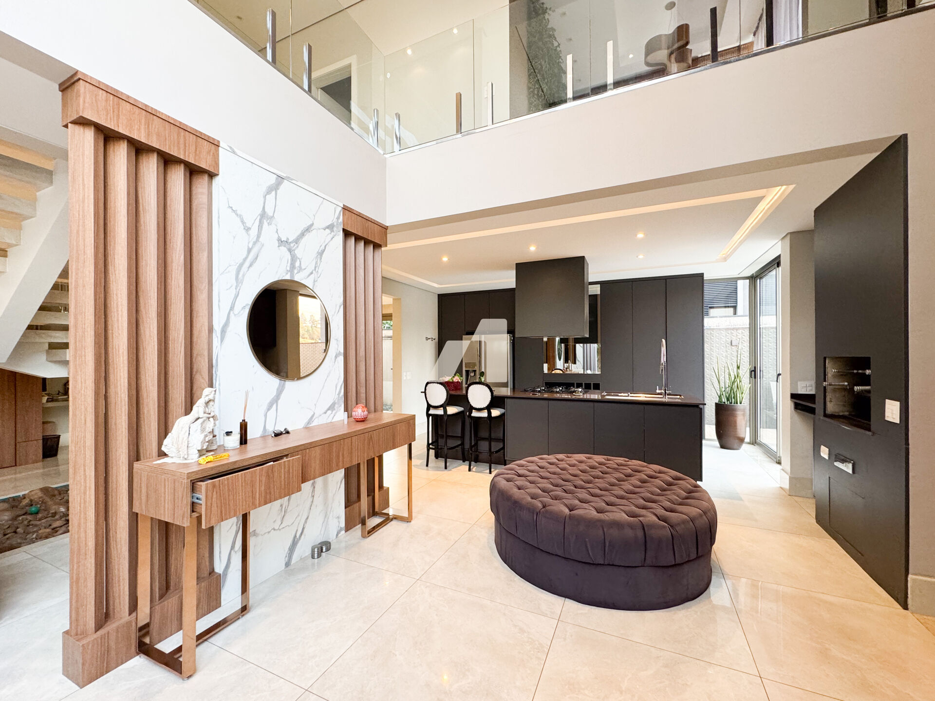 Espaço para Home bar/adega, Churrasqueira, Sala de jantar, hall de entrada em marcenaria aparador com pés em aço inox, Sala com painel de tv e parede revestida com porta oculta em mdf. Piscina com borda infinita, iluminação, prainha e ducha cascata.