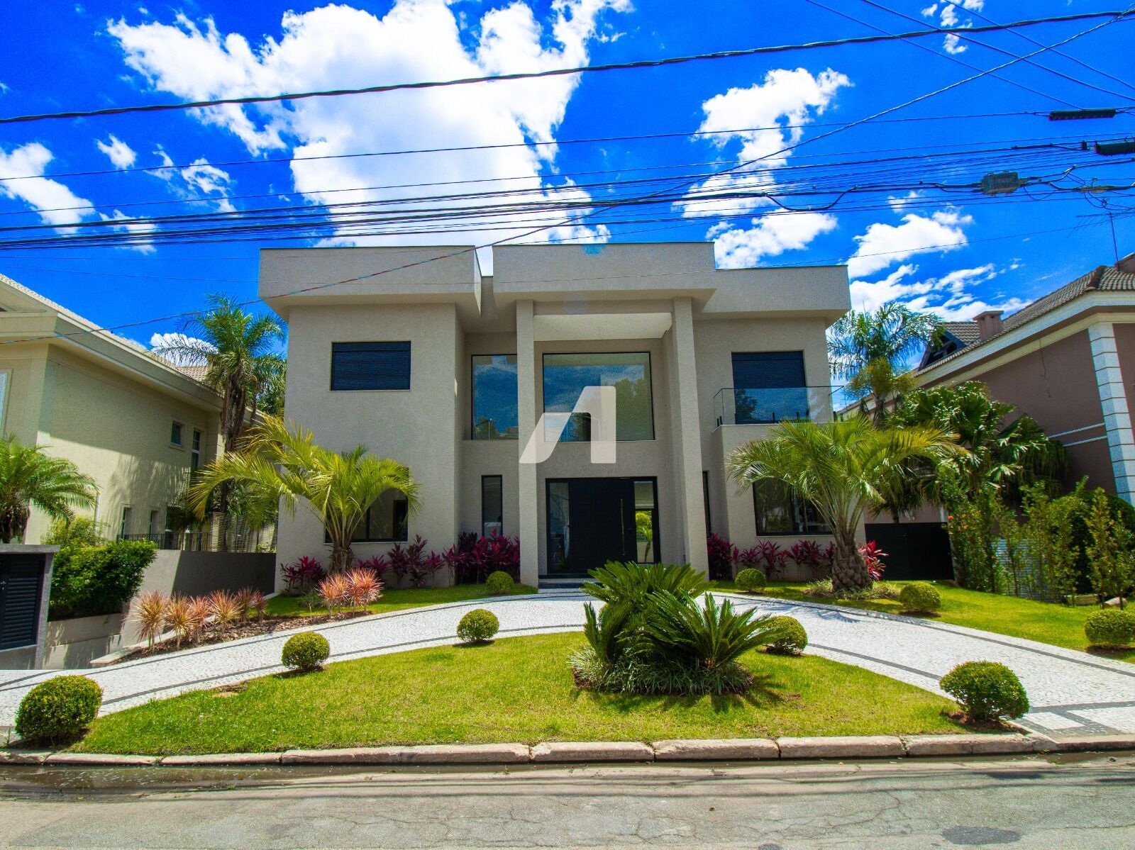 Entrada em meia-lua externa com espaço para 3 carros
